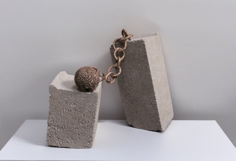 Boulet associe un boulet en bronze, référence explicite aux entraves des prisonniers, à deux blocs de parpaing bruts.